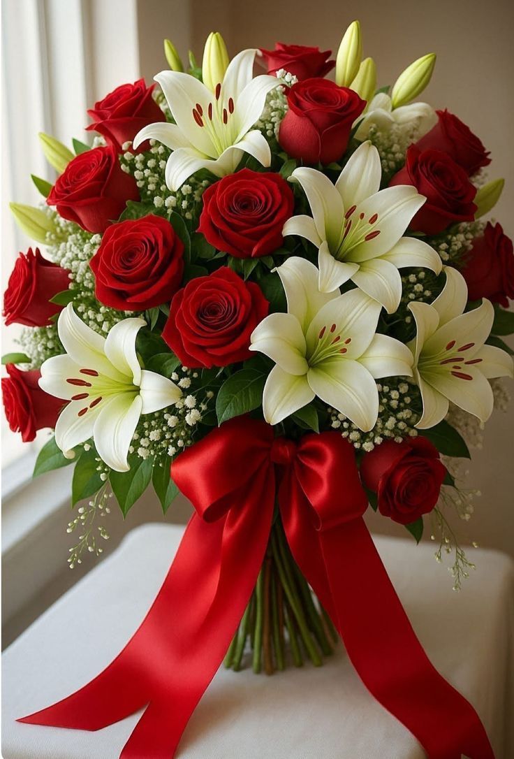 Bouquet of red roses, white lilies, baby's breath, a variety of greens, and a bow in a clear vase.