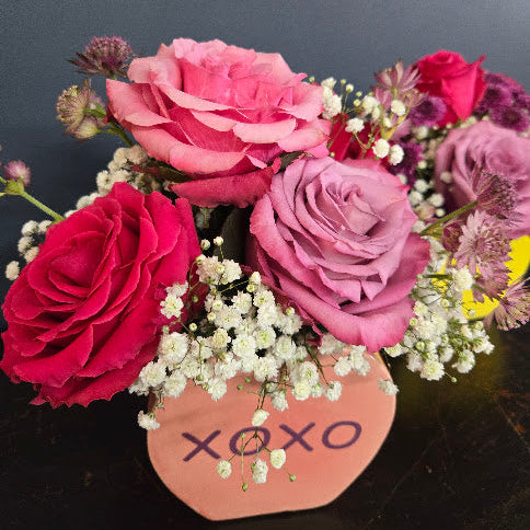 Assorted heart-shaped containers, each uniquely designed with six roses and filler flowers.