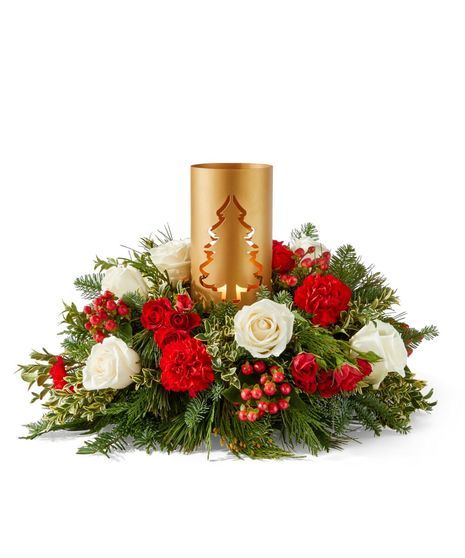 Beautiful candle centerpiece with roses, carnations, berries, a mixture of Christmas greens, and holly.