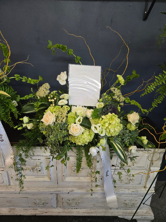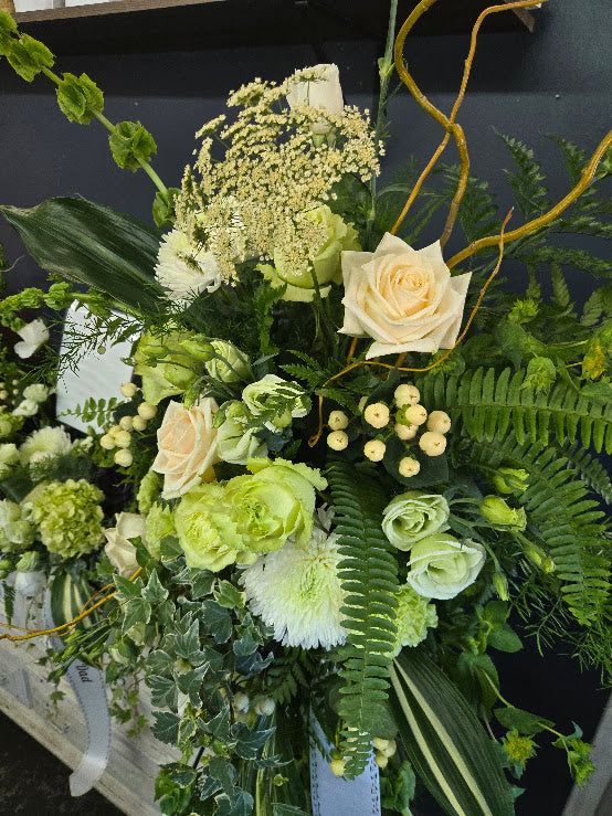 Sword Fern, Bakers Fern, Springeri, and Aspidistra, and accented with Curly Willow.