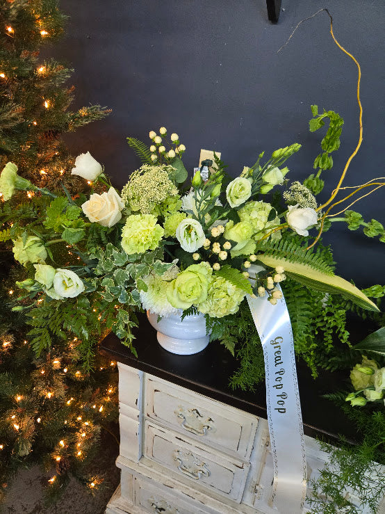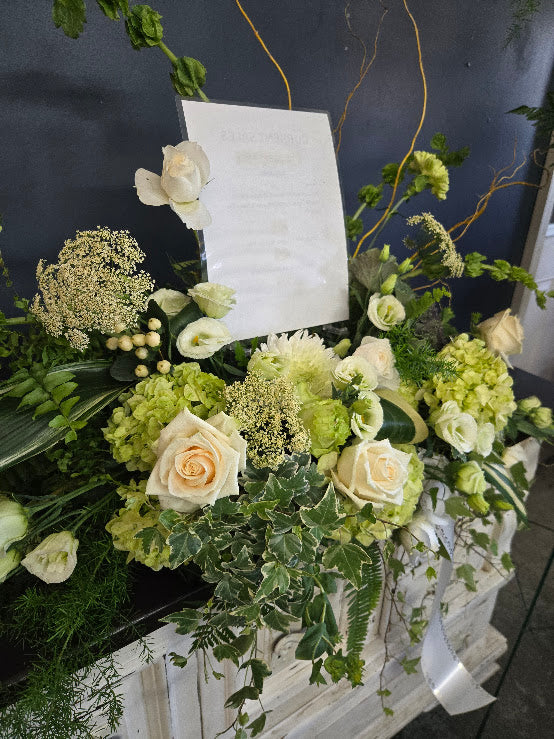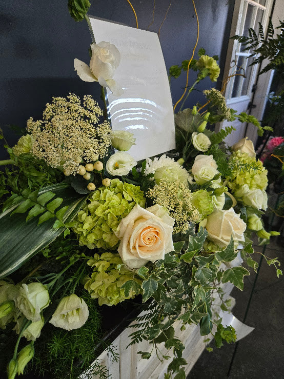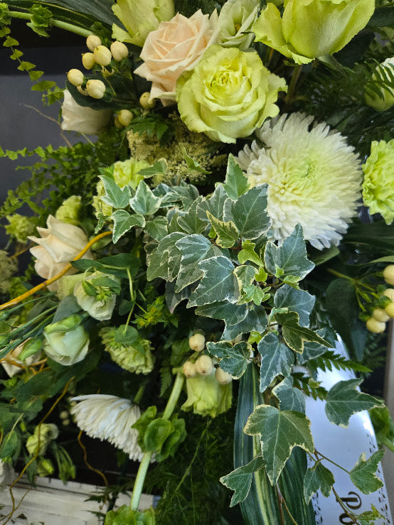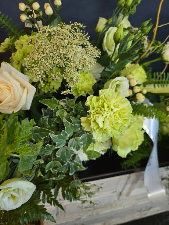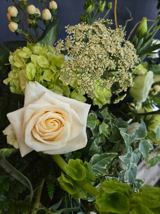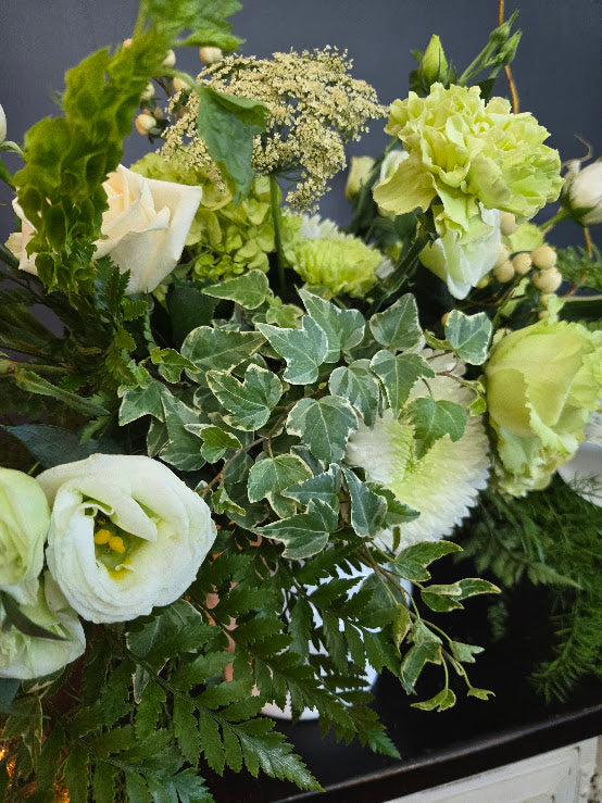 Made with Bells of Ireland, Laceflower, Soul Roses, Cloud Garden Roses, Shamrock Hydrangeas, Green Carnations, Green Lisianthus, White Football Mum, Ivory Hypericum, and Bupleurum.