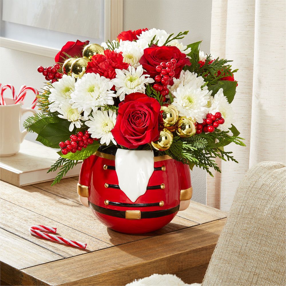 The Nutcracker is a specialty container with a Christmas bouquet of red roses, white cushions, red carnations, a variety of Christmas greens, and berries. Accented with gold ornaments.
